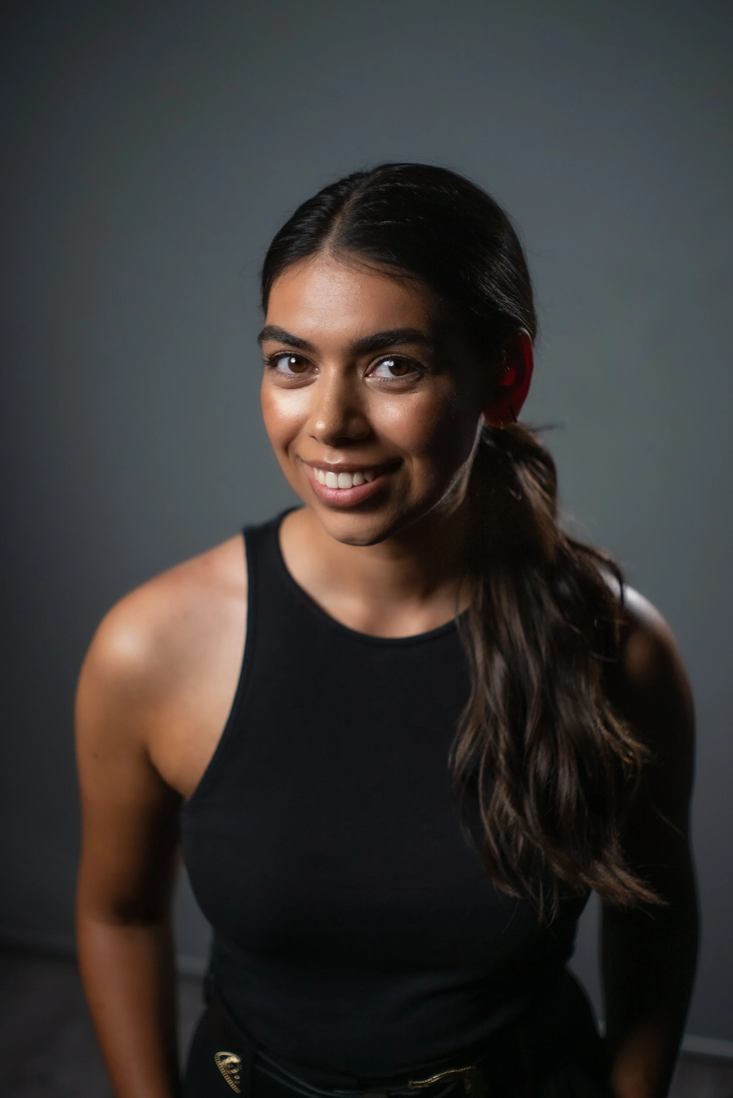 A young woman with long dark hair in a ponytail wearing a black sleeveless top smiles at the camera against a dark gray background.